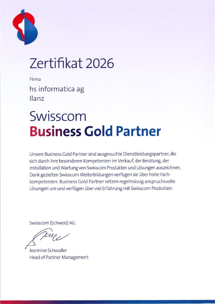 Wir freuen uns, bekanntzugeben, dass die informatica ag ab sofort den Status Gold Partner von Swisscom trägt. Diese Auszeichnung bestätigt unsere langjährige Expertise und unser hohes Engagement im Bereich der Swisscom-Lösungen.